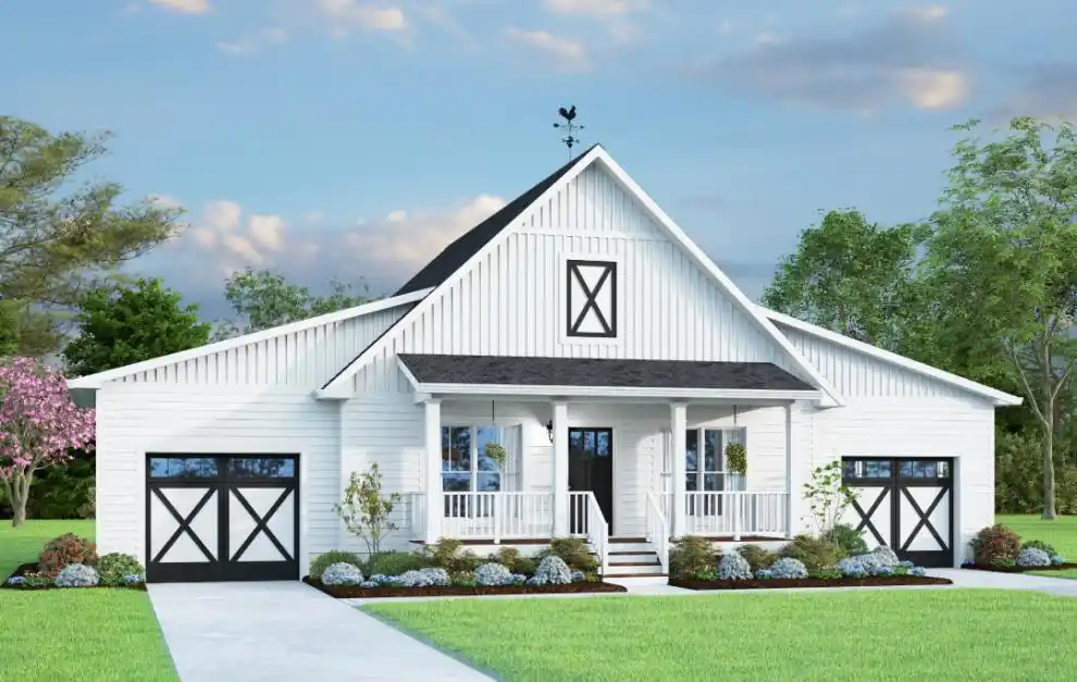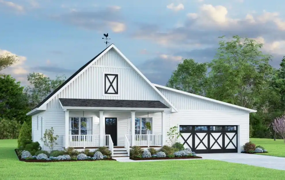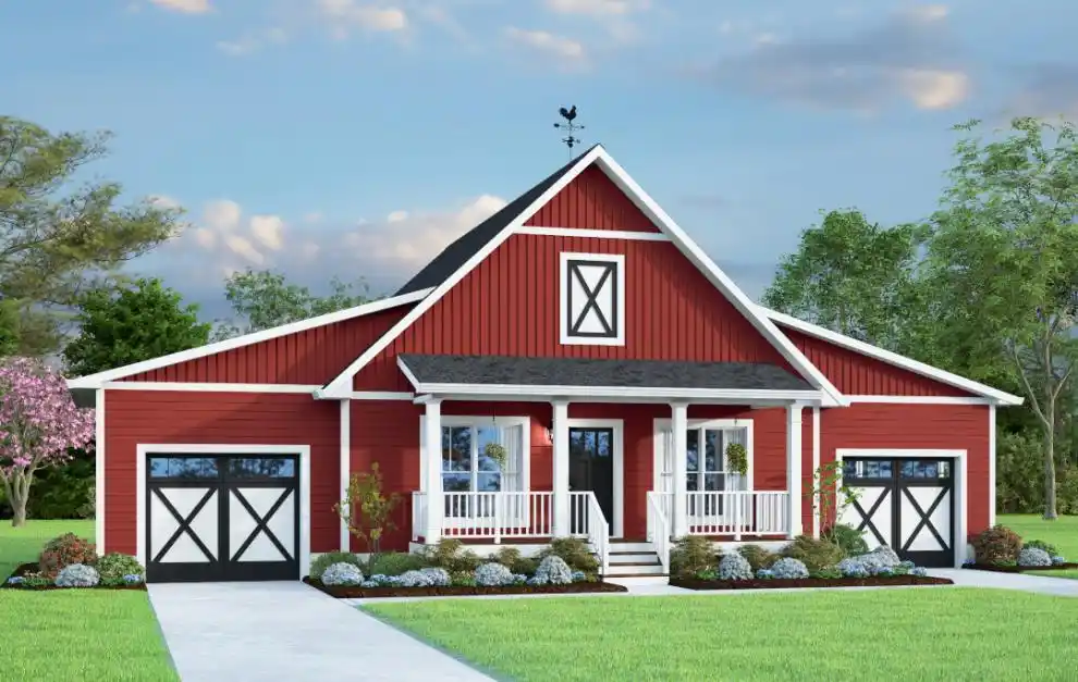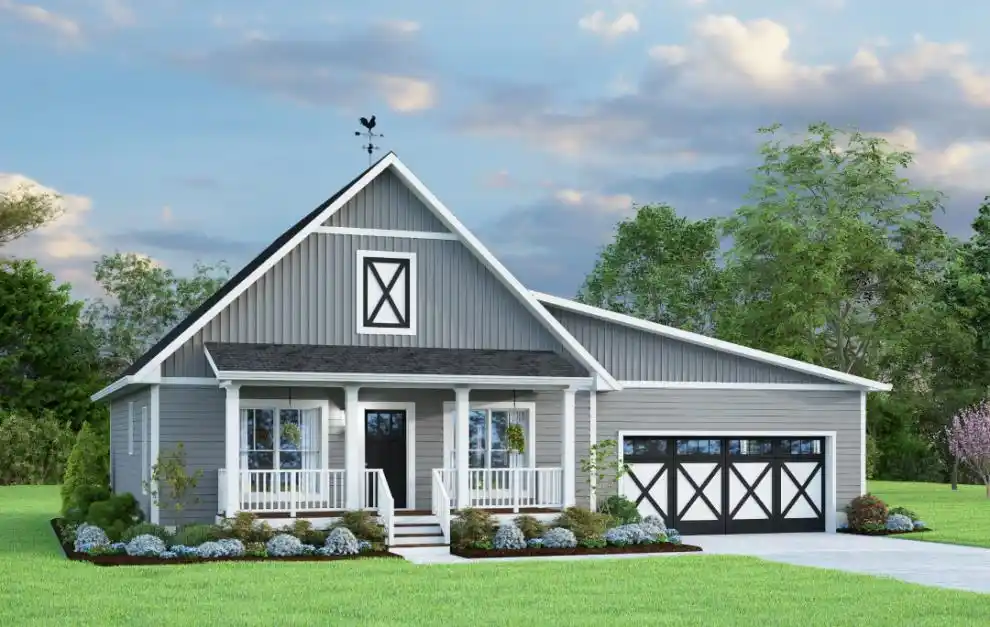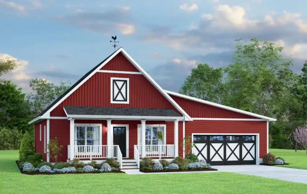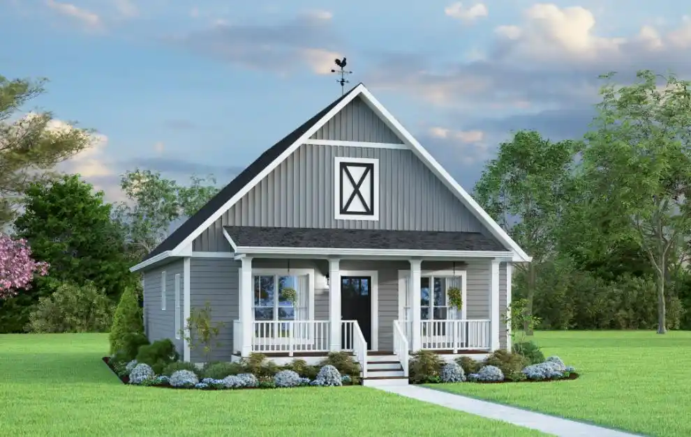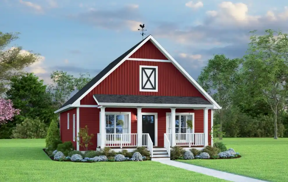 This attractive Barndominium style house has a high roof pitch, weather vane, and faux hay door. The inside is open concept with 3 Bedrooms and 2 Baths with an island in the Kitchen.