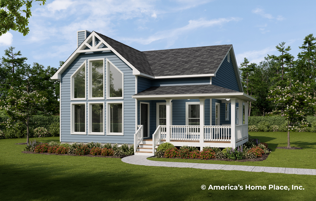 This charming 2-bedroom, 2-bathroom home brings a cozy cabin ambiance, perfect for the country or mountain setting. With a wrap-around covered porch and a spacious back porch, there’s ample outdoor space to take in the scenery. Inside, relax in the living room with its stunning glass viewing wall and vaulted ceiling, designed to maximize the view. This floor plan provides a warm, inviting retreat with plenty of room for comfort.
