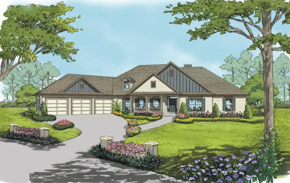 This traditional ranch style home, with Board & Batten facing, provides an open floor plan with an angled 3-car garage. This plan has 4 bedrooms plus a study. The master has two grand walk-in closets. The 2nd and 4th bedrooms share a jack-and-jill bath. The utility room provides a folding island for your convenience. In the back of the home there is a deck in addition to the covered porch. This 3028 square foot home has all the features your family desires.